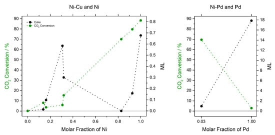 Coking and CO2 conversion during temperature-programmed DRM reaction in dependency of the surface molar fraction of Ni (left) and Pd (right) of all prepared catalysts. The molar fraction of Ni was obtained before, the amount of reaction-induced carbon monolayers and the integral CO2 conversion after temperature-programmed DRM reaction.