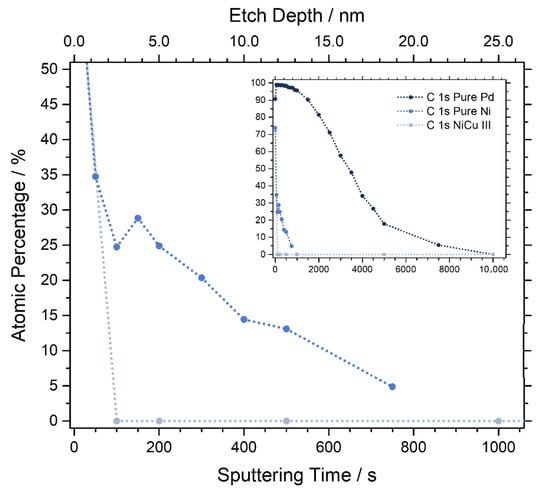 XPS depth profile of the C 1s section of pure Pd, pure Ni and NiCu III after temperature-programmed DRM reaction. An etch depth calibration of the sputtering time was conducted from tactile profilometer measurements, resulting in a conversion factor of 0.025 nm/s.