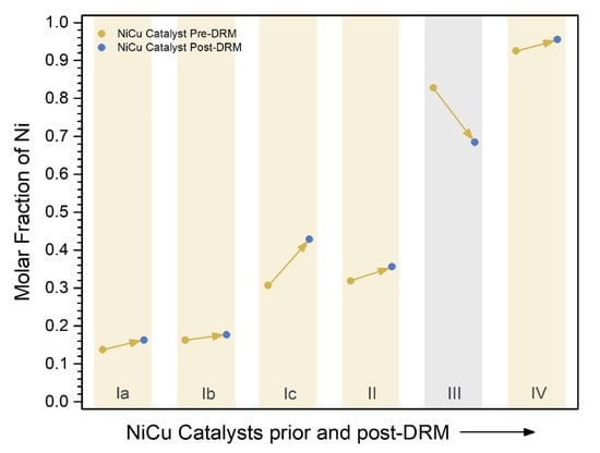 Since the DRM performance of NiCu catalysts depends critically on the surface composition, they need to retain specific stability under these conditions. It is known that segregation processes occur in NiCu solid solutions, on which the surface is enriched with Cu due to the lower surface energy of Cu compared to Ni [,]. Furthermore, NiCu systems possess a wide miscibility gap at low temperatures, leading to the expectation of coexisting Ni-rich and Cu-rich bimetallic phases before and after specific heat treatments []. Wolfbeisser et al. reported that NiCu alloys show only a limited stability during methane decomposition, during which the carbon-induced segregation of Ni species occurred []. Therefore, the compositional variation of the investigated NiCu catalysts, in particular of their surfaces, was examined throughout DRM testing. Figure 8 illustrates the surface molar fraction of Ni before and after the DRM of all prepared NiCu catalysts, with values taken from Table 4, and indicates an overall Ni surface enrichment, except for NiCu III.