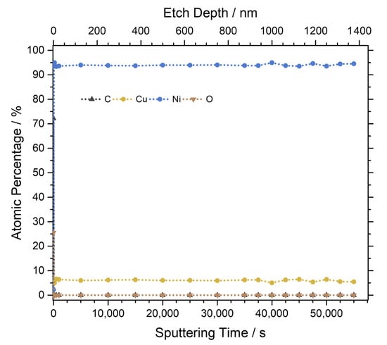 For the NiCu and NiPd alloy formation, Cu (Alfa Aesar, 99.9999%, 0.1 mm thick, Thermo Fisher Scientific Inc., Waltham, MA, USA) and Pd foil (99.95%, 0.1 mm thick, Goodfellow GmbH, Hamburg, Germany) were evaporated in a modified modular high vacuum chamber, described in Section 3.2, onto the ultra-clean Ni foil through thermal evaporation, respectively. Whereas the substrate was kept at a constant temperature of 211 °C throughout the copper deposition, in order to attain the improved initial wetting of the ambient-contaminated Ni surface by the evaporated Cu metal, and subsequently, cooled down. It was only heated once for 5 min at 211 °C prior to the experiment, and substrate heating was switched off during the Pd deposition process, as the surface wetting by Pd was found to be superior. The coating thickness of the thin films was monitored by a quartz crystal microbalance.