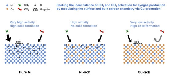Nevertheless, for the modulation of the surface and bulk carbon chemistry via Cu promotion of the Ni bulk catalysts, a qualitative kinetic scenario of the CH4 and CO2 activation kinetics towards the DRM process is proposed in Figure 10, which provides a simplified schematic representation of three types of Cu promotion, namely the pure Ni bulk, the Ni-rich NiCu bulk-intermetallic and the Cu-rich NiCu bulk-intermetallic catalysts, and their reaction behaviour under DRM conditions. According to the observed coking susceptibility, pure Ni bulk systems render a high C-dissolution via enhanced methane decomposition, as indicated by the broader reaction arrow in Figure 10 (left side), leading to an extended graphene/graphite growth. In turn, an overly Cu-rich surface is expected to exhibit insufficient CO2 dissociation sites (Figure 10, right side), where methane decomposition could induce an unwanted kinetic prevalence in increased C deposition, even though the nucleation kinetics of graphene/graphite on the surface are suppressed through limited C-dissolution. Hence, reducing the adsorption and bulk diffusion rate of the surface carbon to an extent should allow for a virtually immediate clean-off by simultaneously adsorbed CO2 and retain an appropriate high syngas production rate, alongside the almost total suppression of carbon deposition, as indicated by the Ni-rich NiCu bulk-intermetallic catalysts.