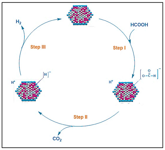 Using a catalytic dehydrogenation process can release the hydrogen contained in FA through two main pathways (i) dehydrogenation/decarboxylation yielding H2 and CO2, and (ii) dehydration/decarboxylation yielding H2O and CO (Equations (1) and (2)) [54,55,56].