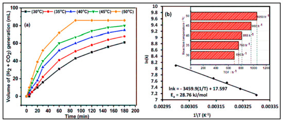 Volume of H2 gas evolution from the aqueous FA solutin and the corresponding TOF: (a) Volume of (H2 + CO2) gas formed from formic acid decomposition vs. time, and (b) TOF of H2 values produced with the Au1Pd3/rGO catalyst at (30–50 °C). Reproduced from ref. [87] with permission from the Royal Society of Chemistry.