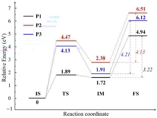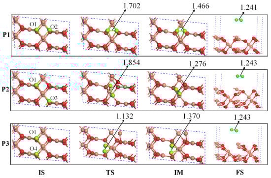 The IS column in Figure 1 shows the relaxed structure of the CuO(110) surface of O-terminated. The oxygen atoms on the CuO(110) surface of O-terminated are of the same chemical type as the three-fold coordinated atoms. Yet, oxygen atoms may be in different environments and combine in different paths. O1, O2, O3, and O4 were assigned to the four oxygen atoms on the CuO(110) surface of O-terminated (see Figure 1). In order to determine the possible O2 formation process, an O1 atom was removed and reintroduced to bond with three neighboring O atoms, including O2, O3, and O4. Subsequently, these configurations were optimized. The optimization results show that the O1 atom forms bonds with the O2, O3 and O4 atoms with bond lengths of 1.466 Å, 1.276 Å, and 1.370 Å, respectively. These bond lengths are close to those of the free O2 molecule (1.124), implying that an O2 complex is formed in the three structures. Therefore, the O2 formation processes of O1-O2, O1-O3, and O1-O4 were considered and denoted by path 1 (P1), path 2 (P2), and path 3 (P3), respectively. For the calculation of O2 formation processes, the perfect CuO(110) surface of O-terminated was set as the initial state (IS). The final structure was the stable configuration with the O2 complex, which was denoted by the IM (intermediate state). Then, a transition state (TS) search calculation was performed. The TS structure and the corresponding energy profile for the process are shown in Figure 1 and Figure 2. The energy barriers of the path 1, path 2, and path 3 are 1.89 eV, 4.47 eV, and 4.13 eV, respectively. In addition, all three processes are endothermic by 1.72 eV, 2.38 eV, and 1.91 eV, respectively. These results suggest relatively large differences in the three paths of O2 formation processes.