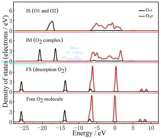 To provide further insight into the O anion diffusion process, the density of states in the IS, TS, and FS was investigated. The partial density of states (PDOS) of the O atom during the diffusion process in path 4 is presented in Figure 10. The electrons of the O atom in IS delocalize in a wide range near the Fermi energy level (Ef = 0 eV), implying that the O atom is more chemically active. In comparison to IS, the DOS of the O atom in TS has a higher peak at approximately −4.98 eV, indicating that an energy barrier is required to transition from IS to TS. In addition, the p-orbital of the O atom in FS is similar to that in IS, while the s-orbital of the O atom in FS is slightly lower than that in IS, which is consistent with the finding that the O anion diffusion process in path 4 has an energy barrier of 0.24 eV and is exothermic by −0.02 eV.