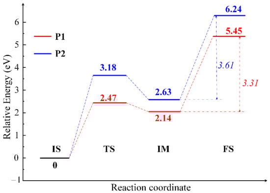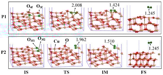 Next, the oxygen release reaction on the CuO(111) surface was simulated. Of particular note, the oxygen release reaction on the CuO(111) surface was studied by the work of Zhang et al. []. However, the calculation methods were slightly different from those in this paper. In order to make the results in this work as comparable as possible, the O2 formation and desorption processes were still calculated here, and the results are shown in Figure 4 and Figure 5. There are two pathways for oxygen release on the CuO(111) surface, which are denoted as path 1 (P1) and path 2 (P2). The details of model construction are not repeated here. The energy barriers of O2 formation in path 1 and path 2 are 3.18 eV and 2.47 eV, respectively. Both O2 desorption processes are largely endothermic by 3.61 eV and 3.31 eV, respectively. The calculated results are quite similar to those that are reported in the literature [] (see Table 1). Comparing the calculation results of the CuO(110) surface with that of the CuO(111) surface reveals that there is the lowest energy barrier and total energy in path 1 on the CuO(110) surface. In particular, the activation energy values of oxygen release on CuO studied by experiments (3.26 eV and 3.41 eV) [,] were close to the energy barrier of path 1 on the CuO(110) surface, while largely smaller than that of other pathways. The analysis above indicates that the CuO(110) surface may also play an important role in the oxygen release reaction, and the active sites in the oxygen release process on the CuO surface exist in pairs.