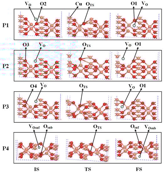 For this calculation, the initial state (IS) was defined as an optimized CuO(110) structure with a surface O1 vacancy. The structure CuO(110) with a surface O2 (O3 or O4) vacancy was optimized and denoted as the final state (FS). Accordingly, three O anion diffusion paths were constructed and denoted as path 1 (P1), path 2 (P2), and path 3 (P3), respectively. In addition, considering that O anion may diffuse from the lattice to the surface, the fourth pathway was constructed and denoted by path 4 (P4), in which IS was defined as an optimized CuO(110) structure with a surface oxygen vacancy (denoted as VOsuf) and the FS was defined as an optimized CuO(110) structure with a subsurface oxygen vacancy (denoted as VOsub). Figure 6 and Figure 7 show the TS search results and the corresponding energy profile for the processes. The energy barriers of path 1, path 2, path 3, and path 4 are 0.51 eV, 1.75 eV, 1.32 eV, and 0.24 eV, respectively, indicating that the energy barriers of O anion diffusion in CuO(110) are extremely low. In particular, the energy barrier of O anion diffusion in path 4 (0.24 eV) is significantly lower than that of the O2 formation (1.89 eV, 4.13 eV, 4.47 eV) and O2 desorption processes (3.22 eV, 4.13 eV, 4.21 eV). In addition, all the four processes are exothermic by −0.43 eV, −0.48 eV, −0.47 eV, and −0.02 eV, respectively. These results imply that O anion diffusion in CuO(110) can react readily and is energetically favorable.