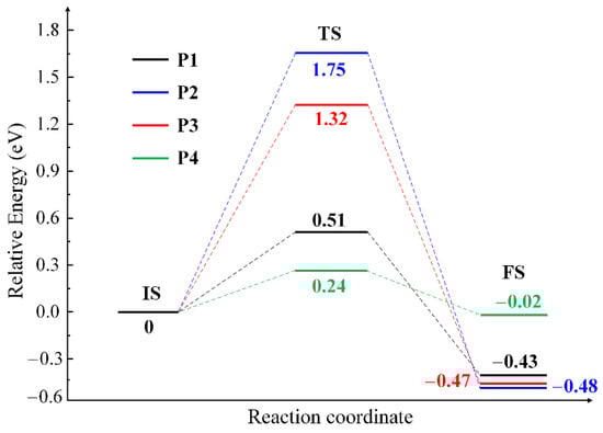The cut-off energy (350 eV) and the density of the Monkhorst Pack scheme k-point of 4 × 4 × 1 were chosen to be sufficiently high. The kinetic energy cut-off employed in all calculations was 350 eV, and was used together with the Monkhorst Pack scheme k-point of 4 × 4 × 1. The criteria for the convergence of all calculations in this work were set to (i) an energy tolerance of 2.0 × 10−5 eV/atom; (ii) a maximum force tolerance of 0.05 eV/Å; (iii) a self-consistent field tolerance of 2.0 × 10−6 eV/atom; and (iv) a maximum displacement tolerance of 0.002 Å. The following equation was used to calculate the energy barriers (Eb) of various reactions: