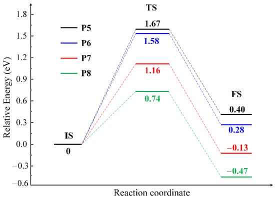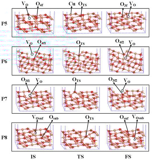 Next, the O anion diffusion processes in the CuO(111) slab were studied. The O4f atom migrating to O3f vacancy, O4f atom migrating to O4f vacancy, O3f atom migrating to O3f vacancy, and subsurface oxygen atom (Osub) migrating to surface oxygen vacancy (VOsuf) were considered as four possible O anion diffusion paths in the CuO(110) slab. Correspondingly, the four paths were denoted by path 5 (P5), path 6 (P6), path 7 (P7), and path 8 (P8), respectively. The optimized structures of IS and FS are shown in Figure 8. The reaction pathway and energy profile for the O anion diffusion in the CuO(110) slab are shown in Figure 8 and Figure 9. The energy barriers of path 5, path 6, path 7, and path 8 are 1.67 eV, 1.58 eV, 1.16 eV, and 0.74 eV, respectively, which are also rather small. The results indicate that the O2 formation and desorption are the rate limiting steps for oxygen release from CuO. Therefore, the key to improving the reactivity of Cu-based oxygen carriers is to decrease the energy barrier of O2 formation and desorption processes. In addition, the average energy barrier of O anion diffusion in the CuO(111) slab is higher than that in the CuO(110) slab. Moreover, the path 5 and path 6 are endothermic by 0.40 eV and 0.28 eV, respectively. On the contrary, path 7 and path 8 are exothermic by −0.13 eV and −0.47 eV, which suggests that path 7 and path 8 are energetically favorable. In addition, the average reaction energy of O anion diffusion in the CuO(111) slab is also higher than that in the CuO(110) slab. By comparing the two slabs, path 4 in the CuO(110) slab is regarded as the most favorable pathway for O anion diffusion due to the lowest energy barrier and exothermic process. In the diffusion process of path 4, the Osub atom migrates from the original location to the intermediate position between the surface and subsurface O vacancy. In addition, the subsurface Cu-Osub bond is gradually rupturing. Before populating the surface oxygen vacancy, the Osub atom bonds to the surface Cu atom. Given the above results, it can be found that the O anion migrates more easily in the CuO(110) slab, which further confirms the possibility that CuO(110) is important during oxygen release from the CuO. If the ratio of CuO(110) can be increased, though it is a difficult challenge, the oxygen release performance of the Cu-based oxygen carrier will be effectively improved. Nevertheless, there is a similarity between CuO(110) and CuO(111) slabs, in that paths 4 and 8 have the lowest energy barriers in their respective slabs, indicating that the O anions diffuse more easily from the lattice to the surface.