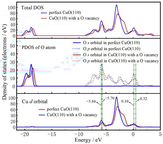 Moreover, the energy barriers of the O anion diffusion process are substantially lower than those of the O2 formation and desorption processes, which could be caused by the O vacancy in CuO. In order to illustrate this, the density of states of the perfect CuO(110) slab and that with an O vacancy were studied. The total density of states (TDOS) and the PDOS of the O atoms are presented in Figure 11. It is observed that the TDOS for the CuO(110) slab with an O vacancy is more flat than that for the perfect CuO(110) slab, suggesting a larger delocalization in the former. In addition, for the perfect CuO(110) slab, the Cu d-orbital is hybridized with the O p-orbital as shown by the state overlap at approximately −5.84 eV and 0.10 eV, respectively. While the hybridized peaks occur at approximately −5.70 eV and 0.32 eV in the CuO(110) slab with an O vacancy. As seen from Figure 9, both hybridized peaks shift lower in energy after the formation of an O vacancy, indicating a weaker interaction of Cu with the O atom in the CuO(110) slab with an O vacancy, which facilitates O anion migration. This result may provide an idea for increasing the reactivity of oxygen release, that is, increasing oxygen vacancies. However, the oxygen vacancy creation energy in CuO was calculated to be 7.4 eV. The positive value means that energy is needed to create an oxygen vacancy in CuO.