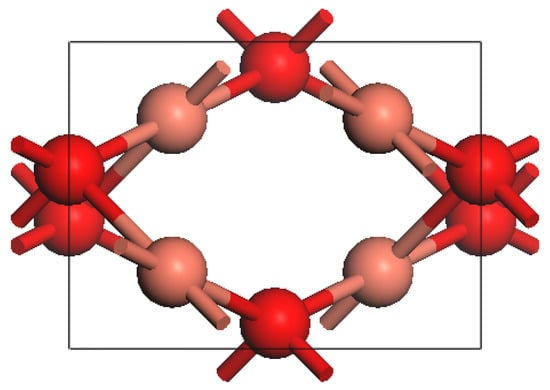 Schematic representation of a CuO unit cell. The salmon pink spheres denote Cu atoms, and the red spheres denote O atoms, respectively.