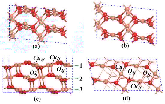 (a) O-terminated CuO(110) surface, (b) Cu-terminated CuO(110) surface, (c) the top view of a CuO(111) slab with different types of Cu and O atoms, and (d) the side view of a CuO(111) slab with different types of Cu and O atoms. The salmon pink spheres denote Cu atoms, and the red spheres denote O atoms, respectively.