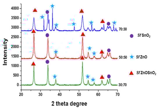 The results exhibited in Figure 3 represent the three bimetallic materials. In all the displayed spectra, we observe three diffraction peaks which are attributed to (220), (422) and (440) located at 2θ degree of 28°, 52° and 63°. These indicate the formation of the bimetallic Sf ZnOSnO2 nanoparticles and are also represented by the red triangle as indicated in Figure 2. These results were also confirmed by reports from [26,34], where these peaks confirmed the formation of bimetallic ZnOSnO2 nanoparticles. Moreover, diffraction peaks representing ZnO and SnO2 are also observed. We observe that the dominant diffraction peaks on the 30:70 ratios are from Sf SnO2, namely (101), (200), (221), (220) and (002), which indicates the higher presence of Sf SnO2. For the 50:50 loading, we can observe that the diffraction planes of ZnO and SnO2 are in harmony, which confirms the equal molar concentration contribution of the two metal oxides [39,40]. The 70:30 ratio had more phases from Sf ZnO, as indicated by the (100), (002), (010), (200), (112) and (201) diffraction peaks, which could also indicate the percentage loading caused by the molar ratio of ZnO. To further understand these materials, morphological analysis was also conducted, as represented in Section 3.3.