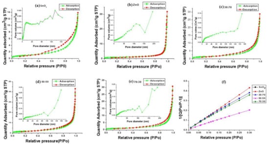 The adsorption–desorption isotherm, the pore size plot and the surface area plot of the materials of (a) SnO2, (b) ZnO, (c) 30:70, (d) 50:50 (e) 70:30 and (f) Linear plot relative to pressure of surface area.