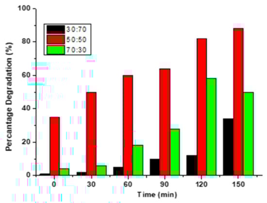 Figure 6 exhibits the photocatalytic degradation of the three bimetallic ratios of the 30:70, 50:50 and 70:30 against the MB dye for 150 min with respect to time. During the adsorption–desorption process, some form of adsorption was noted for all the ratios, in particular the 50:50 ratio, as 34% of the dye was adsorbed. This could be caused by the high presence of ZnO in these two ratios, which was more dominant than in the 30:70. Furthermore, ZnO is also known to have a higher absorption efficiency. It can also be observed that when the light was introduced after 30 min, the 30:70 ratio started the degradation slowly and reached a plateau at 150 min, with the highest degradation of 34.76%. This could be because SnO2 is known to possess a larger bandgap than ZnO [44]. The higher molar ratio of SnO2 might have decreased the photocatalytic activity of the 30:70 ratio. The 50:50 ratio increased the degradation removal of dye when the irradiation time was also increased, until it reached the highest removal of 88% at 150 min. The images showing the degradation taken from the 50:50 experiments are presented in Figure S3. From this analysis, it could be noted that a higher degradation efficiency was achieved with the 50:50 material compared to the other two materials. This could be because, at equal amounts of loading, the level of composing material permits the surface to allow more active sites that increase the degradation activity [41]. Moreover, according to Sehar et al. [24], the disoriented shapes such as tubes and rods tend to increase the surface area, which can produce more active sites within the catalyst. Furthermore, the spheres could have assisted by trapping more light from the light source and allowing more activity, as the active site would degrade the dye. The 70:30 ratio indicated that the material reached saturation at 120 min, with the highest degradation of 58%.