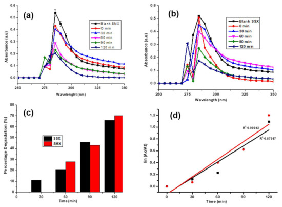 (a,b) Absorbance plots of SSX and SMX, respectively, (c) percentage degradation of the antibiotics and 9 (d) kinetic plots of SSX and SMX.
