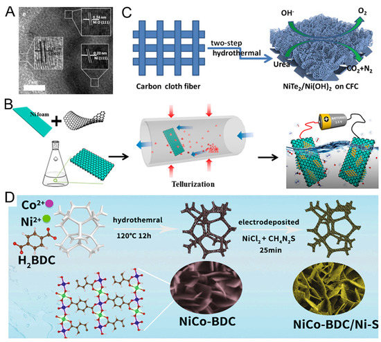 (A) TEM and HRTEM images of Ni–NiO/Gr–450 °C [95]. Reproduced with permission [95]. Copyright 2021, Elsevier Ltd. (B) Schematic illustration of synthesis processing of NiTe/rGO/NF [101]. Reproduced with permission [101]. Copyright 2019, American Chemical Society. (C) Schematic illustration of synthesis processing of hybrid NiTe2/Ni(OH)2 nanosheets [97]. Reproduced with permission [97]. Copyright 2019, Elsevier B.V. (D) Schematic illustration of synthesis processing of NiCo–BDC/Ni–S nanosheets [98]. Reproduced with permission [98]. Copyright 2021, Elsevier B.V.