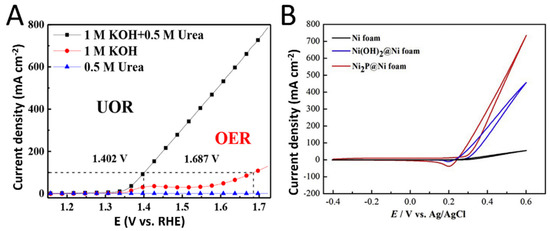 Nitrogen element compounds with nickel, especially N and P, have extremely enhanced charge density states around the Fermi level which endows it with high electrical conductivity, beneficial for electrocatalytic processes in terms of electron transfer rate. Numerous efforts have been devoted for N- and P-based nickle compounds to modulate electronic structure and geometric effect to improve UOR electrocatalytic performance. Mei et al. demonstrated a novel bifunctional MOF-derived Ni3N, which firstly synthesizes Ni(OH)2 on NF by hydrothermal reaction followed by calcination (Figure 6A). The 3D catalyst was shown to be highly active and durable for UOR, requiring 1.337 V to achieve 10 mA cm−2 [102]. Sun et al. proposed a method using porous Ni3N nanosheet arrays on carbon cloths (CC), called Ni3N/CC, via nitridation with NH3 from a Ni(OH)2 nanoarray precursor on CC. Ni3N/CC exhibited high and durable performance for UOR and achieved 10 mA cm−2 with only 1.35 V in 1 M KOH with 0.33 M urea [103]. Hong et al. developed carbon-doped hetero-structured Ni2P nanoparticles (named C@Ni2P) by a hydrothermal strategy and tailored by surface engineering of peapod-assisted nanorods and nanoparticles. C@Ni2P presented high performance for UOR in terms of current density and initial potential. These outcomes can be attributed to a higher surface area which leads to more accessible active centers and decreased blocking effect [104]. Cao et al. synthesized a porous Ni2P nanoflower which was supported on NF (Ni2P@Ni foam) by a hydrothermal method and phosphating strategy (Figure 6B). After delicately tailoring the catalyst structure, the Ni2P@Ni foam reached peak current density of 750 mA cm−2 with initial potential of 0.24 V (vs. Ag/AgCl) and superb stability in 0.60 M urea with 5.00 M KOH solutions [105].