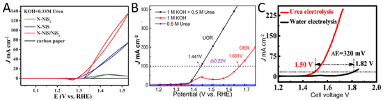 Alloying different metals such as hybrids with non-metal elements or composites with other metallic oxides is a common strategy to enhance catalytic activity of Ni-based catalysts [30,31,32,33,34,35,36,37,38,39,40,41,42,43,44,45,46,47,48]. A few studies have investigated non-Ni-based catalysts. The typical three electrode system is used to evaluate the activity of UOR and which catalyst directly or indirectly supports highly conductive substrates such as glass carbon, nickel foam, and carbon cloth as work electrode, reference electrode (Ag/AgCl, Hg/HgO, or Hg/HgSO4), and counter electrode (Pt plat, mesh, wire or carbon rod) [12].