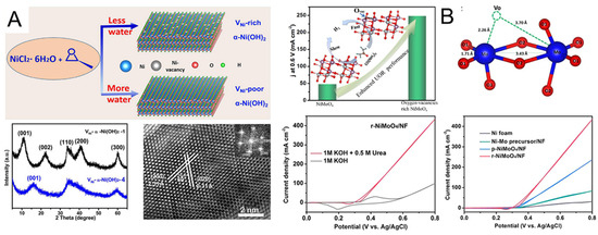 Other modifications of nickel-based materials occur on macro and micro levels such as oxygen vacancy, Schottky heterojunction, and nickel vacancy and have important influences in the electrocatalytic field and understanding the underlying correlations between microstructures and intrinsic UOR activity. Peng et al. proposed a lattice-oxygen-involved UOR mechanism on Ni4+ which has more favorable reaction kinetics than conventional UOR mechanisms. In accordance with DFT, in situ IR spectroscopy, mass spectroscopy, and performance testing, 18O isotope-labeling is directly involved in UOR, which could transfer CO* to CO2 and accelerate the reaction rate. Finally, the resulting catalyst containing Ni4+ exhibits a high current density of 264 mA cm−2 at 1.6 V vs. RHE on a glassy carbon electrode, outperforming the state-of-the-art catalysts for UOR by five times [120]. Wang et al. proposed that metals and semiconductors can combine through phases to form the Mott-Schottky heterojunction, which promotes non-precious-metal catalysts for UOR activities. According to the above concept, the author designed a Mott-Schottky catalyst through an electrochemical reduction converting the semiconductor CoMn2O4 to metallic CoMn. The catalyst enhanced metallicity and electron redistribution, reduced reaction barriers, and promoted the breaking of chemical bonds in UOR processing, which finally exhibited superior catalytic activity that achieved a 100 mA cm−2 current density with only 1.36 V vs. RHE, as well as excellent stability [121]. Song et al. developed various nickel hydroxide (α-Ni(OH)2) samples with adjustable nickel vacancy concentrations by an electrochemical reconstruction method to comprehensively understand the correlation between intrinsic structure and catalytic mechanisms (Figure 10A). Based on DFT and experimental measurements, the reconstruction of α-Ni(OH)2 showed that the introduction of VNi-enhanced intrinsic conductivities and thereby improved activities for UOR [122]. Xie et al. fabricated oxygen-vacancy-rich NiMoO4 through a defect engineering strategy using a top-down hydrothermal method on NF (Figure 10B). Experimental and DFT results further confirmed that O-vacancies rich in NiMoO4 can have synergetic effects with higher exposed active sites, faster electron and mass transformation, and low reaction barriers of UOR processing, significantly enhancing electrocatalytic activity [123].