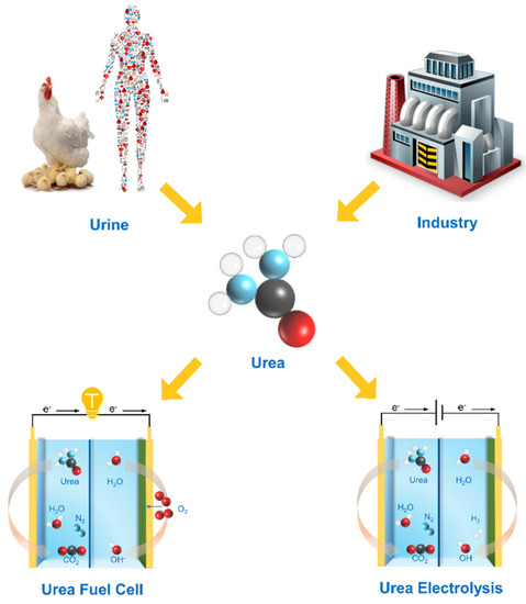 Urea, a type of nontoxic organic compound that contains carbon, nitrogen, oxygen, and hydrogen elements, is used as an extremely important nitrogenous fertilizer in agricultural production [1,2]. From a biomedical view, it is an important component in urine; as a metabolite of the human body, it is an important metabolic substance [3]. The amount of urea is closely associated with the health of individuals [4]. Precise early-stage detection of urea in urine plays a significant role in medical diagnosis as it can effectively indicate the status of the human body [5,6]. In terms of environmental pollution, large quantities of untreated wastewater contaminated with urea, including industry production and human as well as animal urine, can cause serious environmental problems as it decomposes into ammonia with nitrogen-based pollutants (e.g., NO, NO2) [7,8,9]. Urea as an energy carrier is non-flammable, easily stored and transported, and has an energy density of 16.9 MJ L−1 which is 10 times than that of hydrogen. From an energy utilization perspective, it can release huge amounts of energy when used for fuel combustion [10,11]. Therefore, effective detection, treatment, and consumption of urea is of great significance to industrial production, environmental treatment of urea-rich wastewater, and even healthcare [12,13].