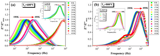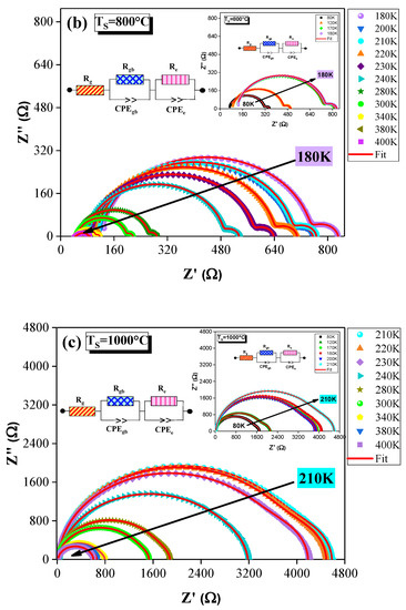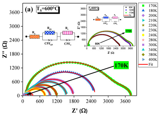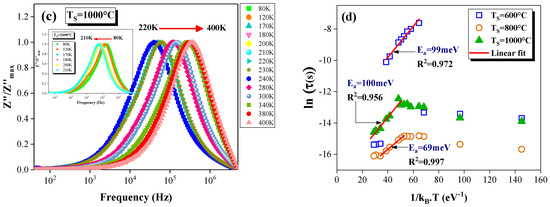 - Rahmouni, H.; Jemai, R.; Nouiri, M.; Kallel, N.; Rzigua, F.; Selmi, A.; Khirouni, K.; Alaya, S. Admittance spectroscopy and complex impedance analysis of Ti-modified La0.7Sr0.3MnO3. J. Cryst. Growth 2008, 310, 556–561. [Google Scholar] [CrossRef]