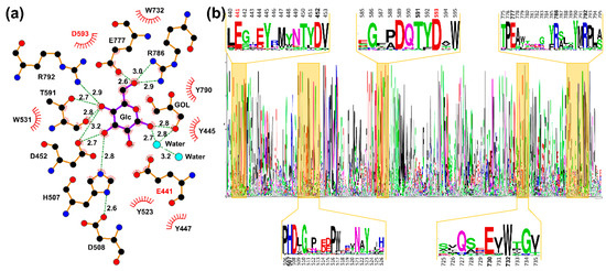 TxGH116 glucose-binding residues. (a) Binding sites of TxGH116 wild type structural model with glucose ligand. The ligands and protein side chains from wild type TxGH116 bound to glucose (PDB: 5BX5) [17] are shown in a ball-and-stick representation, with the ligand bonds colored in purple and protein bonds in brown. Hydrogen bonds are shown as green dotted lines, while the spoked arcs represent protein residues making nonbonded contacts with the ligand. Water molecules located in the active site are shown as cyan circles. The 2D ligand–protein interaction diagram was made by LigPlot+ [34]. (b) Sequence logo of 34 diverse sequences that are from the GH116 family in different species. The conserved regions around the active site are highlighted, glycone sugar-binding residues’ positions in the sequence are shown in bold, and catalytic residues are labeled in red bold print. Amino acid conservation analysis was performed to assess the conserved residues in GH116 enzyme family members.