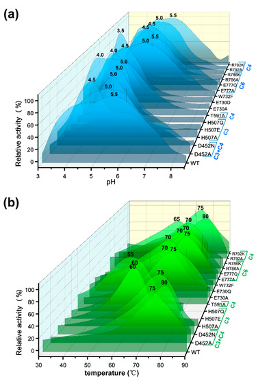 Optimal pH (a) and temperature (b) analysis of mutants and wild type (WT) TxGH116. All assays were carried out in triplicate. The 3-D stacked graph was made by Origin 8.0 with Bézier curves. C3, C4, C6, and C3 + C4 represent the glucose carbons carrying hydroxyls interacting with the side chains of the amino acid residues that were mutated.