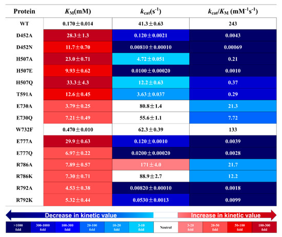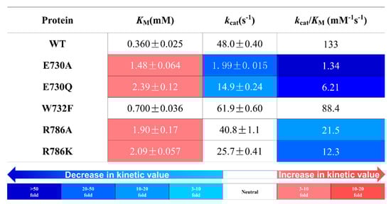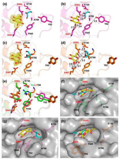 Glycone-binding residues were identified in the complex of TxGH116 wild type with glucose (PDB: 5BX5) [17], and show high conservation in GH116 family enzymes from different species in Figure 1a,b. The polar interactions between these residues and glucose include H507 with C3OH, D452 with C3OH and C4OH, T591 with C4OH, and E777 and R786 with C6OH. In addition, E730 interacts with R786 and W732, which makes a hydrophobic interaction with C6 in Figure 1a and Figure S1. The catalytic nucleophile, E441, also makes a hydrogen bond with the glucose C2OH, but this is difficult to separate from its catalytic function, and the mutation of this residue was previously studied [17,33]. We systematically mutated for the glucose-binding residues mentioned above and characterized the kinetics of the mutants to elucidate their relative importance and specific roles.