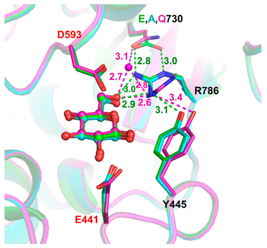 Structures of E730A (cyan) and E730Q (magenta) with glucose ligand. The glucose ligand molecules are positioned similar to that in the wild type (green, PDB: 5BX5 [17]). One water molecule that takes the position near that vacated by the R786 residue guanidinyl group in E730Q mutant is shown as a magenta ball. Hydrogen bonds and close polar contacts are shown as dashed lines with distances marked (green for wild type and magenta for E730Q).