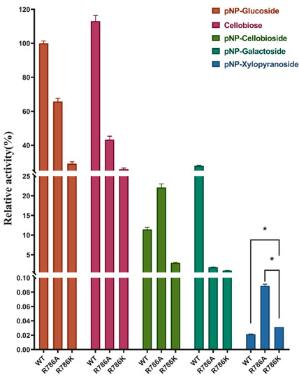 Since R786 interacts with the glucose C6OH group, we tested whether loss of this interaction would affect the sugar specificity, especially for β-D-glucopyranoside versus β-D-xylopyranoside, which lacks this hydroxymethyl group. We compared the activity of the C6OH-related mutants to the wild type on pNPGlc, pNP-β-D-xylopyranoside, pNP-β-D-galactopyranoside, and pNP-β-cellobioside. All the mutants had reduced activity on pNPGlc compared to the wild type, but with pNP-xylopyranoside, R786A and R786K showed high hydrolysis activity compared to the wild type, as shown in Figure 7.