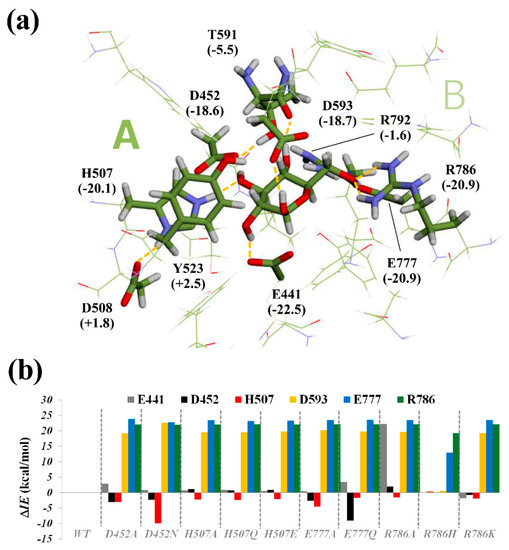 To elucidate the mutation-induced effect on glucose-binding residues, particular interaction analysis, which describes the contribution of each residue in the total binding energy, was conducted for wild type and 10 mutant models (D452A, D452N, H507A, H507Q, H507E, E777A, E777Q, R786A, R786H, R786K), based on the ONIOM method [36,37,38]. The ONIOM-optimized structure of wild type TxGH116-glucose complex and the particular interaction energy (IE) between glucose and the TxGH116 binding site for the wild type and mutants are illustrated in Figure 8 and Figures S11–S14. The BE values of all complexes are plotted in Figure S12, which are in the ranges of −94.8 to −131.7 kcal mol−1 for the mutants and −134.1 kcal mol−1 for the wild type. This result clearly shows that all mutations decreased the binding affinity of glucose to the TxGH116 active site, suggesting the important roles of the TxGH116 binding residues.