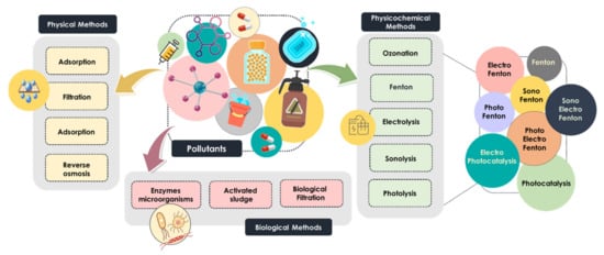 Nowadays, the most common technologies used in water treatment are classified as biological, physical and physicochemical processes (Figure 1). Biological methods, including enzymatic treatment, biological filtration and treatment with activated sludge, are widely applied for the removal of emerging pollutants. Despite their low cost, some persistent organic pollutants are not susceptible to direct biological treatment [], and thus, physical and chemical methods are considered a preferable approach for removing heavy metals and recalcitrant pollutants []. Physical processes are categorized into adsorption, reverse osmosis, sedimentation and membrane-filtration-based processes, whereas the physicochemical methods mainly include electrolysis, Fenton-based processes, photolysis, ozonation and sonolysis [,]. These widely used technologies are commonly called advanced oxidation processes (AOPs). The aforementioned AOPs are considered very promising technologies due to their high efficiency, simplicity and good reproducibility, and consequently, they have received great attention in the search for water treatment solutions [,,].