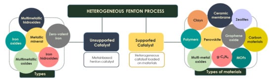 Over the last few years, many publications have proposed the use of different types of heterogeneous catalysts with upgraded characteristics such as activity under a wider pH range, low iron leaching and high stability, which allows their reuse for several cycles []. These catalysts allow achieving reactivity capacities comparable to the homogeneous process. They are mainly divided into two large groups: unsupported catalysts (zero-valent iron, metallic minerals, iron oxides/hydroxides or multimetallic catalysts) and catalyst loaded on materials (e.g., polymers, clays, zeolites) (Figure 2).