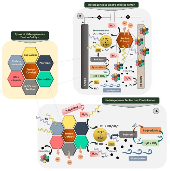 Mechanisms of heterogeneous Fenton processes. (A) Heterogeneous Fenton and photo-Fenton processes. (B) Heterogeneous electro-Fenton and electro-photo-Fenton processes.