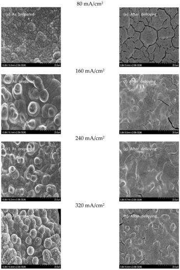 An electrode was prepared by varying the plating current density at a constant electric charge (). Figure 1 shows the electrode surface images taken before (Figure 1a–d) and after dealloying (Figure 1e–h) in plating bath E at different plating current densities. As shown across Figure 1a–d, an increase in the plating current density changes the surface morphology. At the plating current density of >160 mA/cm2, a cauliflower-like structure was found on the deposited electrode that had not been observed at 80 mA/cm2. This structure was formed because the local crystal growth was facilitated by the Ni-ion consumption rate exceeding the Ni ion diffusion rate in the electrolyte with increased plating current density [27]. In addition, a previous study reported that the rate of nucleation increased with the plating current density and formed finer particle size, indicating an inverse proportional relationship between particle size and plating current density [28]. This study observed a decrease in particle size and a cauliflower-like morphology as the plating current density increased. The observation is consistent with the previous study. A crack structure was also observed on the electrode surface after Zn dealloying (Figure 1e–h).