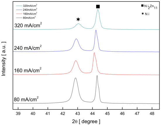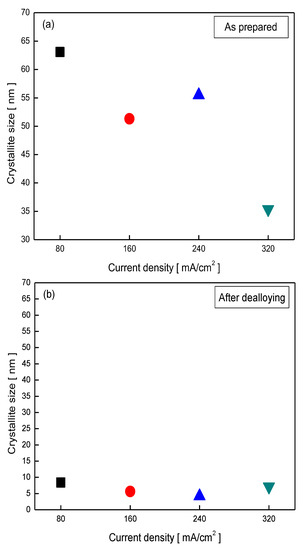 However, after Zn dealloying (Figure 2b), the Ni crystallite size of the electrode resulted in constant regardless of current density. This is presumed to be due to Ni recrystallization in the Ni–Zn alloy during Zn dealloying that decreased the overall crystallite size.