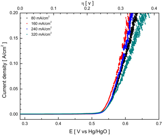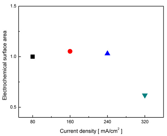 The ECSA of the plated electrode with plating current densities of 80, 160, and 240 mA/cm2 had similar values. It decreased when the plating current density was 320 mA/cm2. The crystallite size of the prepared electrode decreased as the plating current density increased, but it became similar after dealloying Zn (Figure 2). It infers that the dealloying process influenced the electrode’s surface area and crystallite size, and the Ni, Fe, Zn composition could be the main variable to determine the surface properties of the electrode.