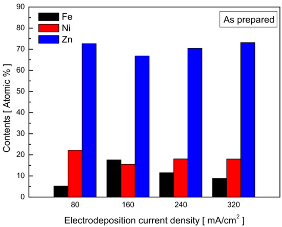 To identify the reason for the difference in activity in terms of the plating current density, the contents of Ni and Fe on the deposited electrode surface were analyzed by EDS, and the results are shown in Figure 4. The Fe content before Zn dealloying increased until the plating current density reached 160 mA/cm2. However, when the current density was increased from 160 mA/cm2 to 240 and 320 mA/cm2, an unexpected decrease in Fe content was observed. The hydrogen produced at the cathode during electrodeposition increases the pH of the electrolyte close to the cathode surface, which results in the generation of Zn(OH)2, Ni(OH)2, and Fe(OH)2. As the reduction potential of Zn(OH)2 is lower than that of both Ni(OH)2 and Fe(OH)2, the Zn deposition preferentially occurs, leading to underpotential deposition.