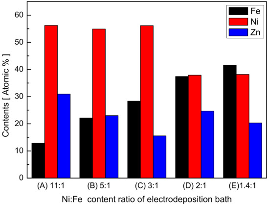 2.2. Characteristics According to the Ni:Fe Ratio in the Plating Bath