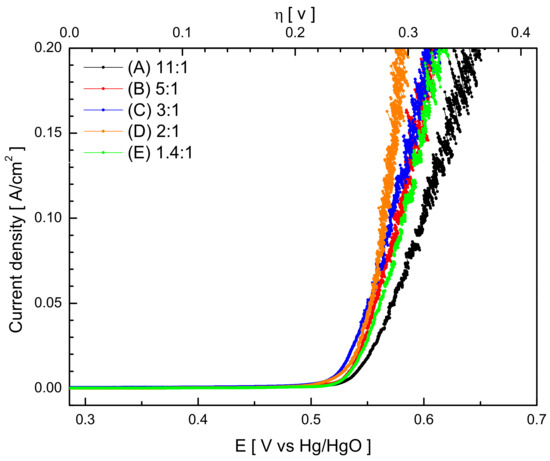 Figure 9 presents the results of LSV applied to the electrode prepared by varying the Ni:Fe ratio in the plating bath. Table 2 presents the OER overpotential at a current density of 100 mA/cm2. The overpotential decreased as the Fe content in plating bath increased up to Ni:Fe = 2:1(Bath D). It is also known that Fe3+ cations substitute for Ni3+ cations of γ-NiOOH, thereby becoming more active [41]. The results obtained in this study agreed with previous studies that reported an increase in OER activity with an increase in Fe content in the electrode. In plating bath E, the overpotential increased despite having the highest Fe content. When the Fe content increases above a certain ratio, the OER activity unexpectedly decreases. This is because the Fe on the electrode surface is segregated in the form of oxides instead of forming Ni–Fe hydroxide in the Ni–Fe alloy, which reduces the number of active sites [19,42].