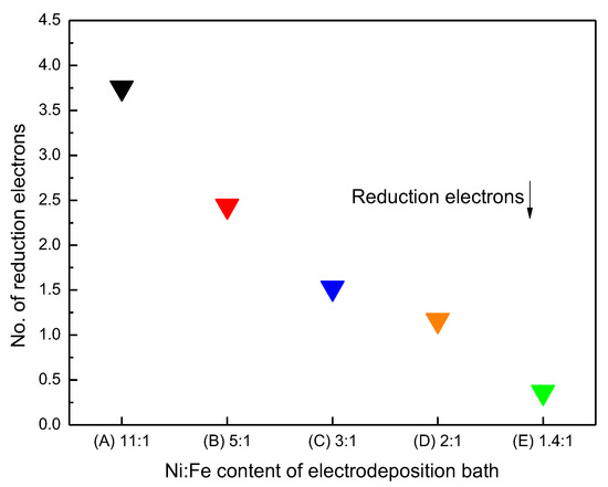 Figure 10 shows a graph of the transferred electrons on the electrode surface during the reduction reaction. To obtain the number of electrons that participated in the reaction, the area of the Ni reduction peak in the CV result shown in Figure 8 was calculated using Equation (7).