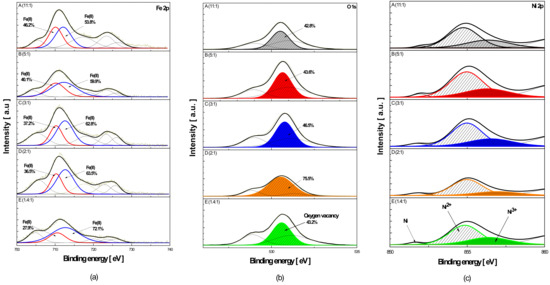 XPS spectra of Ni–Zn–Fe electrode after dealloying according to the different Ni:Fe ratio of the bath (A), (B), (C), (D), (E): (a) Fe 2p peaks; (b) O 1s peaks; (c) Ni 2p peaks.