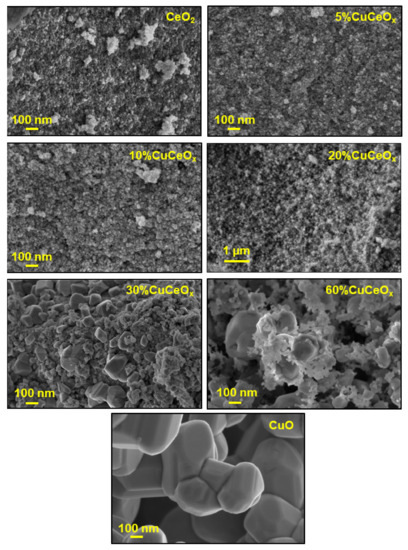 The morphology of the CuCeOx catalysts was investigated by means of FESEM analysis and the micrographs are reported in Figure 2. The CeO2, 5%CuCeOx, 10%CuCeOx and 20%CuCeOx images suggest a good homogeneity of the particle size. Conversely, at higher Cu content, namely, 30 and 60 wt.%, big CuO particles were observed along with small CeO2 nanoparticles. The CuO phase in 30%CuCeOx and 60%CuCeOx presents the typical octahedral or truncated-octahedral shape, confirmed by other research works [56,57].