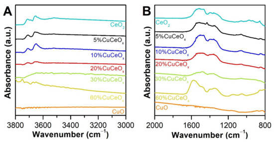 The bands in the 3800–3000 cm−1 region are related to the stretching of the hydroxyl groups. Different OH species are present at the surface of the ceria-rich materials: the band at 3710 cm−1 can be ascribed to isolated OH groups while the intense peak at 3655–3650 cm−1 was assigned to bridging OH [69,70]. The asymmetry of the latter component has been previously attributed to the presence of bridging OH in the proximity of an oxygen vacancy, giving rise to a shoulder at 3640–3630 cm−1 [69]. The less intense band at about 3520 cm−1 may instead be related to triply coordinated OH [69,70]. The presence of a variegated population of OH groups is an index of ceria hydrophilicity. According to previous studies, a hydrophilic support can promote the catalytic activity of metallic active sites [71]. All the hydroxyl species become less abundant at high copper loading and are no more detectable in pure copper oxide, suggesting that Cu doping can reduce ceria hydrophilicity.