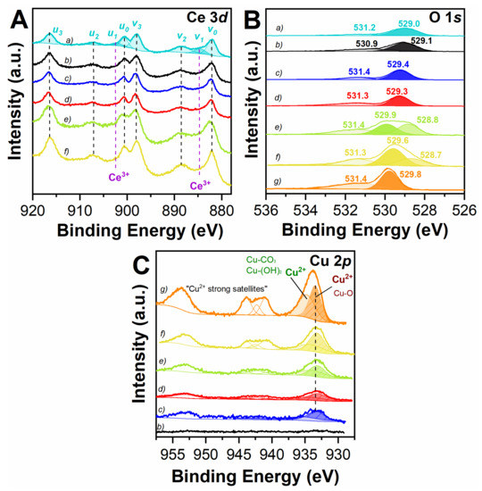 The oxidation state of the elements of interest and the surface species of the catalysts were investigated through XPS measurements. The Ce 3d, O 1s and Cu 2p spectra are reported in Figure 5, while the Cu LMM Auger spectra are shown in Figure S3.