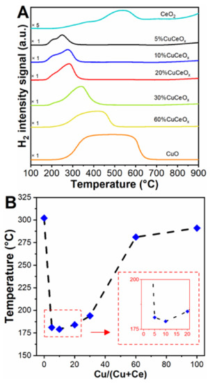 (A) H2-TPR profiles of the CuCeOx catalysts. (B) Trend in the position of the low-temperature reduction peaks as a function of the Cu content in the different samples.