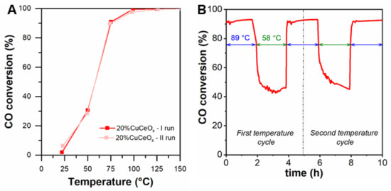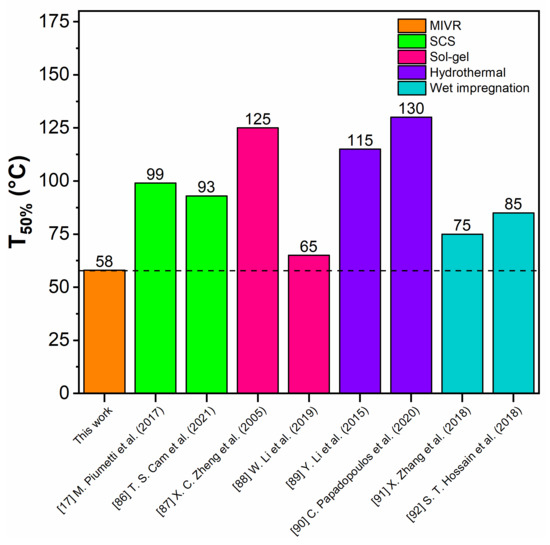 The 20%CuCeOx sample exhibits the lowest T50% (58 °C) comparing with the other Cu–Ce mixed catalysts. Then, a last comparison was performed with Pt/CeO2 catalysts studied in references [93,94,95] and it is possible to conclude the CuCeOx samples show good low-temperature CO oxidation activity compared with ceria-supported noble-metal. Thus, the MIVR method represents a promising synthesis procedure, since it enables to obtain CuCeOx nanocatalysts with very interesting physico-chemical and catalytic properties.