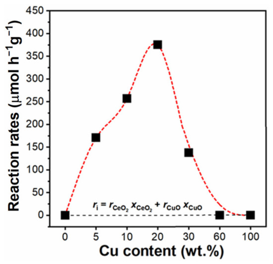 Moreover, Figure 10 shows a black dashed line representing the theoretical reaction rate of a mixture of completely non-interacting CeO2 and CuO phases. This hypothetical rate is defined by the following linear function (Equation (1)):