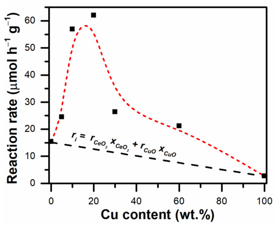 where ri represents the theoretical reaction rate, rCeO2 and rCuO the reaction rates of cerium and copper oxide, respectively, while xCeO2 and xCuO are the mass fractions of cerium and copper oxide. In Figure 10, the red dashed line represents the actual trend of the reaction rates. Interestingly, for all the mixed samples, the real CO oxidation rates are above the theoretical ones (the black dashed line). Thus, a synergistic effect between the two active phases is occurring [96].